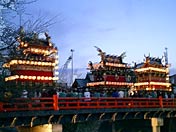 これが笑える!写ってないけど一番左の一台目は電気で一気にポンッと点きました。問題は写真の左端の二台目。なんと二人くらいの人が一個ずつ手でつけ始めた!どうもろうそくらしい。ちなみに提灯は一台に100個くらい。。。周りがなんだか騒がしい・・・。