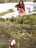 これ!これが見たかった座禅草。禅僧が座禅しているように見えることからついた名前だそうです。不思議な植物があるんだなぁ〜。 ちなみにこの写真、座禅草を撮影しに来ていたおじちゃまに撮ってもらった。さすが撮影に慣れている。 「あそこの雪のある所まで行きませんか?そうしたら座禅草も入れて撮れますよ」って場所の指示もしてくださいました!ほんといい写真で気に入ってます〜。